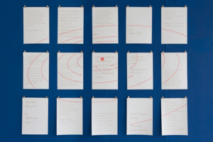 x15 A3 Risoprints (text in gold, Trappist-1 planetary movements in red), golden brass nails, clips, wall in utopian blue