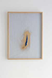 Portable Portal #3 [Tissue paper, gold spray paint, iridescent blue fabric. Frame, glass. 68x50cm]